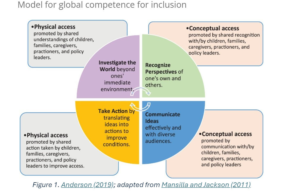 Global citizenship skills and inclusive education have a clear through line: They both emphasize not only the value but also the imperative of diversity in creating a better world. Global citizenship education facilitates the development of the skills needed to recognize this imperative, while inclusive education operationalizes this concept in practice. As described by American University professor Alida Anderson, “global citizenship education has the potential to advance inclusive education and to improve education more broadly” by considering both conceptual and physical access (Figure 1). Global citizenship skills give people the necessary tools to understand and communicate the value of inclusive education—the conceptual access—and to exercise their civic duties to make inclusive education a reality—the physical access.