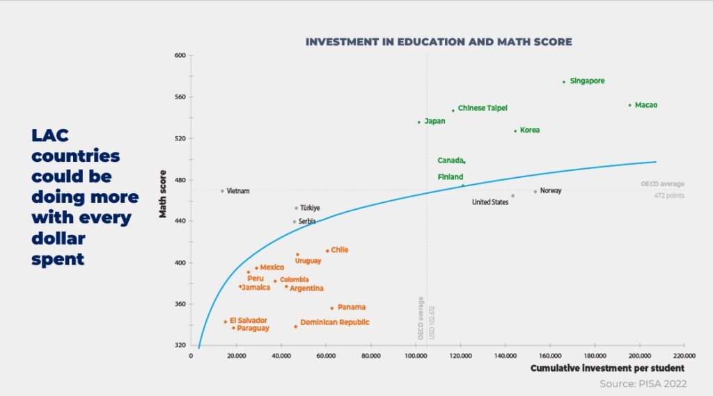 - There is also a relationship between investment and learning. With the current level of investment, we could improve learning outcomes. Therefore, there is room for efficiency. The countries in the region are below the trend line, which means they could achieve better learning results for every dollar they invest.