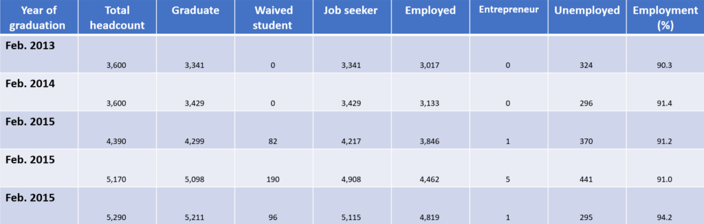 However, additional efforts are required. First, the schools should continue to provide sustainable employment in stable small and medium-sized enterprises. Second, the schools must support graduates’ career paths based on today’s fast-changing industries. Thirdly, the committees in charge of industry-school-government cooperation should make additional efforts to identify reputable partner companies. Fourth, the school departments and curriculums need to continuously meet the rapidly changing demands of industries. Fifth, the schools should work closely with offices of education and government ministries to secure financial support systems. Lastly, the schools must seek ways to develop a lifelong career path for graduates in their respective areas of expertise.