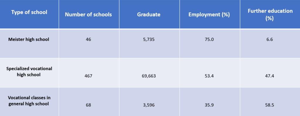 Meister high schools aim to empower students to develop and continue their careers by securing decent jobs for them, allowing them to further pursue a college education while working.This initiative achieved graduated students' employment rates of more than 90% between 2013 and 2017 before the COVID-19 pandemic, and the rates fell to 75% after the pandemic.