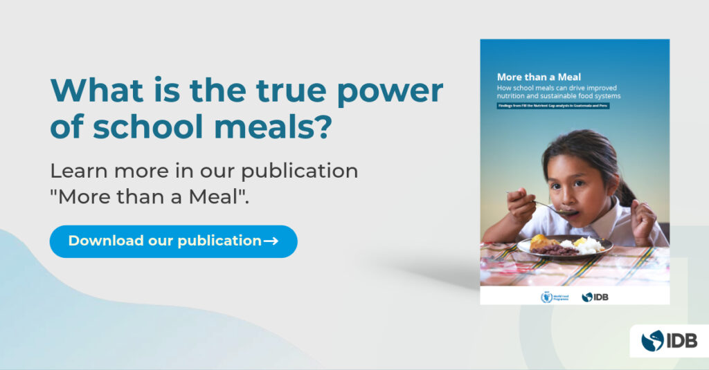 At the IDB, in collaboration with the World Food Programme (WFP), we are advancing this agenda through this new research using the Fill the Nutrient Gap approach in Guatemala and Peru. To learn more about how school meals can drive better nutrition, reduce inequities, and support resilient food systems, download our publication More Than a Meal here.