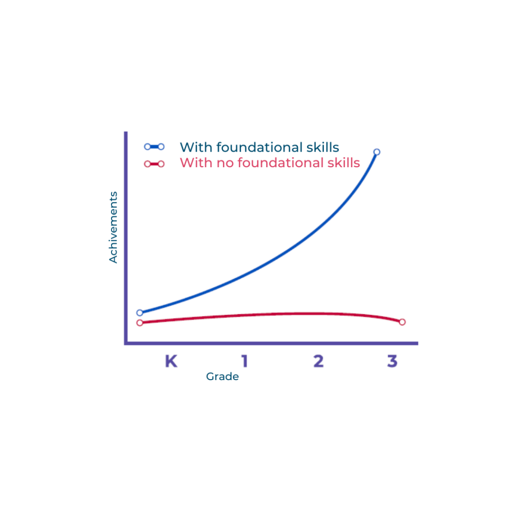 As illustrated in Figure 1, the blue line shows that children who begin preschool (K) with these foundational skills tend to develop them further and experience successful educational trajectories. In contrast, the red line represents those who start school without these skills, who face ongoing difficulties that may lead to dropping out or progressing through the educational system without learning, perpetuating the so-called Matthew effect.
