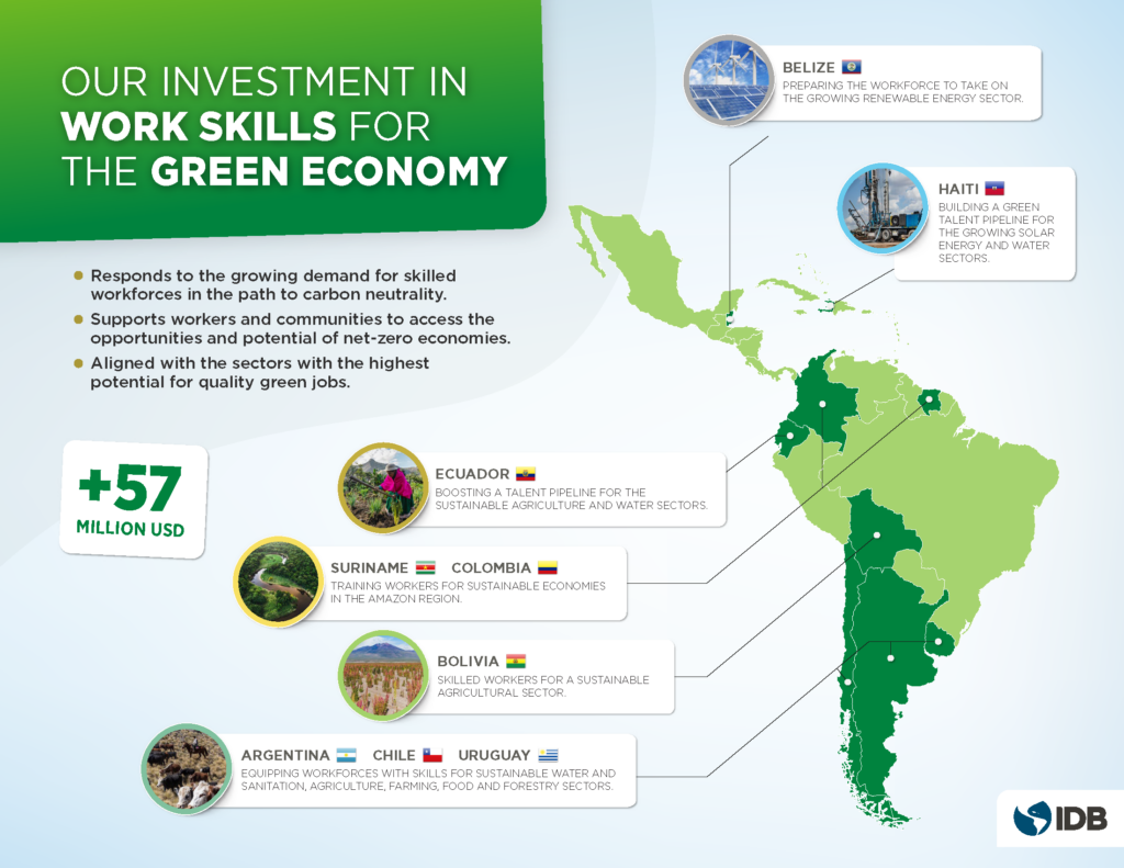 We believe that Latin America and the Caribbean can be part of the solution to the challenges associated with climate change at the global level. Our region is a leader in nature and biodiversity: 30% of its energy comes from renewable energy sources, double the world average, and it concentrates significant amounts of resources needed worldwide, such as lithium and copper, to achieve important sustainability objectives. This also means that, as we respond to climate change and move towards carbon neutrality, entire economic sectors and production processes are going to transform. New jobs will be created, and others will be transformed, replaced, redefined, or disappear.How is climate change transforming jobs in the region and what are the skills required to work in green employment? Let’s see.