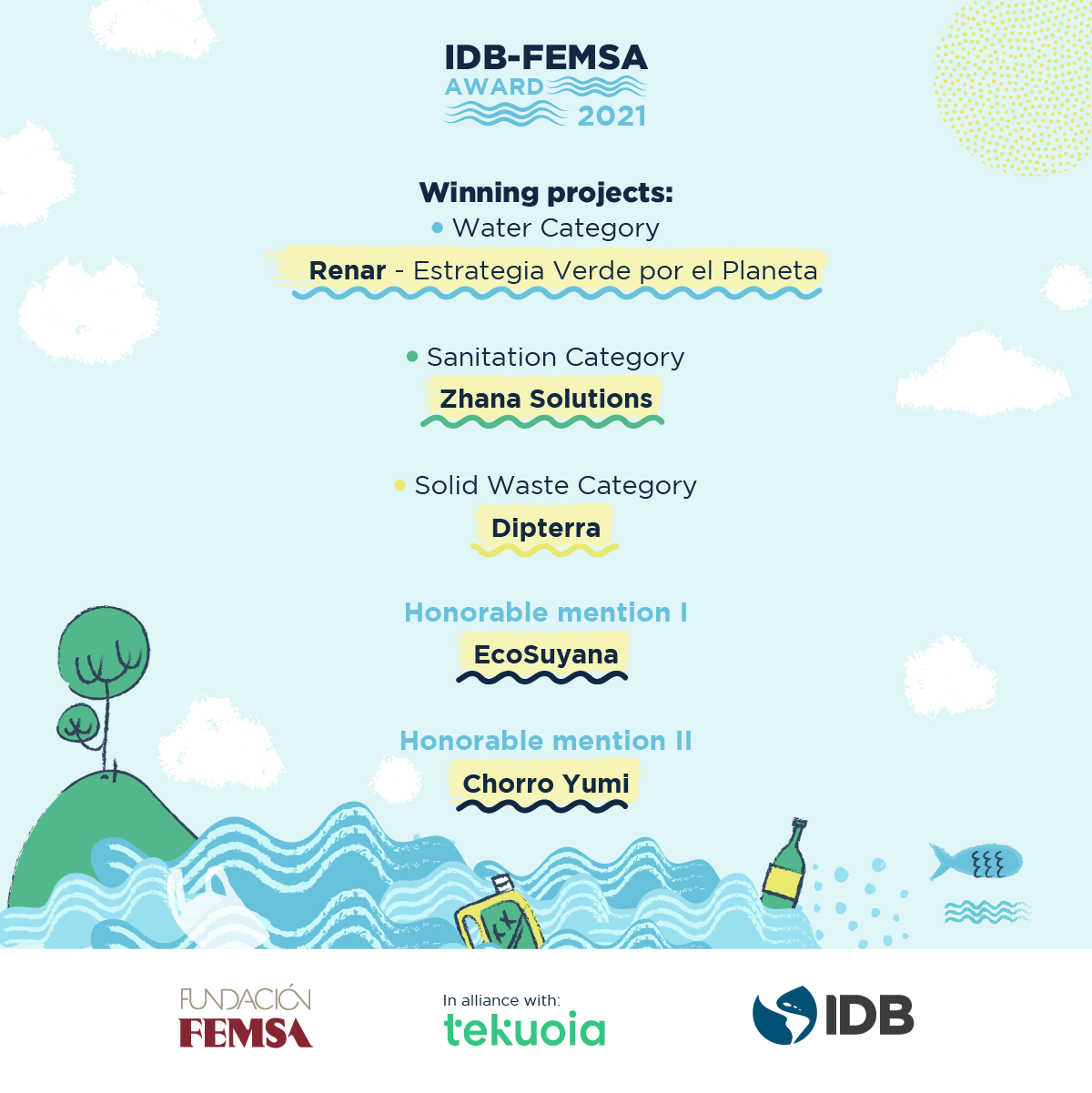 The winners of the IDB-FEMSA Award are RENAR Green Strategy, in the Water category; Zhana Solutions, in the Sanitation category; and Dipterra, in the Solid Waste category. The winner of the Ideas into Action Award is The Closing...