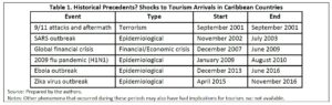 Historical Precedents for the COVID-19 Shock? To determine whether there are historical precedents, the report identified six episodes since 2000 worthy of closer scrutiny (Table 1). A review of these episodes reveals that an appreciable decline in tourism for all three tourism-dependent economies in the region simultaneously was only observed during one of these six periods—the global financial crisis. However, the largest single-year reduction observed during the entire 2000 to 2019 period was only about 6 percent (Figure 1). The near-complete shutdown of travel to Caribbean countries beginning in March 2020 would imply a much larger shock to tourism arrivals and related receipts for 2020. In this context, we conclude that there is no precedent—at least in recent decades—for the current shock to tourism in the Caribbean region.