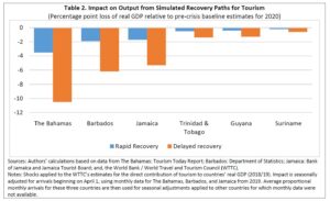 Simulated Shocks to Tourism and their Implications for Growth: In addition to various scenarios with fixed durations and magnitudes presented in the report, the publication presents simulations of alternative recovery paths for tourism flows to the region: a rapid recovery, and a delayed recovery. The ‘rapid recovery’ scenario envisions a 75 percent reduction of tourism flows relative to 2019 during the second quarter (Q2) of 2020, followed by a recovery to 50 percent in Q3, and a return to 100 percent of the level observed in 2019 for Q4. The ‘delayed recovery’ scenario envisions a full cessation of tourism across all Caribbean countries during Q2, followed by a 75 percent reduction during Q3, and a 50 percent reduction during Q4. While simulations do not consider other dimensions of the shock (e.g., the loss of activity due to domestic prevention measures and illness, shocks to commodities trade, financial flows, or the positive influence of stimulus measures, etc.), they do underscore that a crisis whose apex is reached earlier in the year—that is, before the beginning of the peak season in the fourth quarter—could be considerably less damaging than one that remains acute through the end of the year (Table 2).