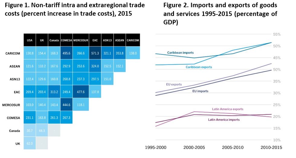 - The CARICOM region is one of the most trade-dependent regions in the world, yet non-trade barriers have continued to increase. Exports and imports combined have averaged 100 percent of GDP in Caribbean countries over the past two decades, higher than the volume of trade in large countries and regional blocks such as the United States of America (USA) (27 percent of GDP), or the Euro Area (81 percent of GDP). While tariffs are low intra-regionally, non-tariff bilateral trade costs in CARICOM countries increased from 95.4 percent in 2000 to 128.6 percent in 2015.