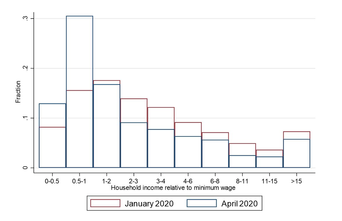 COVID-19 is taking an unprecedented (albeit still unknown) toll on Caribbean region’s economic growth. According to the recently published Caribbean Quarterly Bulletin, the decline in the tourism industry will particularly affect The Bahamas, Barbados and Jamaica. Plummeting international commodity prices are having severe consequences in Guyana, Suriname and Trinidad and Tobago. The crisis is impacting both lives and livelihoods. To understand how, the Inter-American Development Bank carried out an online socioeconomic survey across all 6 countries of the Caribbean. Almost 12,500 households responded over a 2-week period from April 16 to April 30, 2020. Individual data is confidential, in accordance with the standards set by the Internal Review Board of Cornell University, which approved the survey.Four important trends emerge from the data:1. The number of vulnerable households has roughly doubled in the first six weeks of the pandemic. The percentage of Caribbean households with income levels below the minimum wage (the first two columns of Figure 1) increased from 23% in January 2020 to about 43% in April 2020. The figure shows consistent reductions across all income levels, in the fractions of households earning more than the minimum wage.