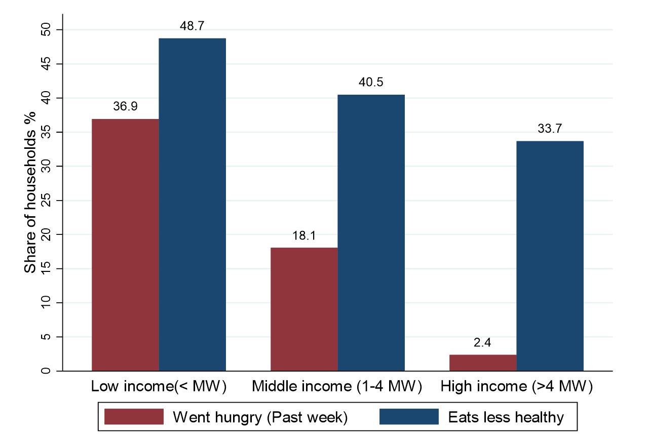 2. Vulnerable households are finding challenges to cover basic needs. Figure 2 shows that 36.9% of households earning below the minimum wage reported experiencing hunger, while 48.7% of them reported deleterious changes in their diet with respect to the pre-pandemic period. These adverse effects become less serious as household income increases.
