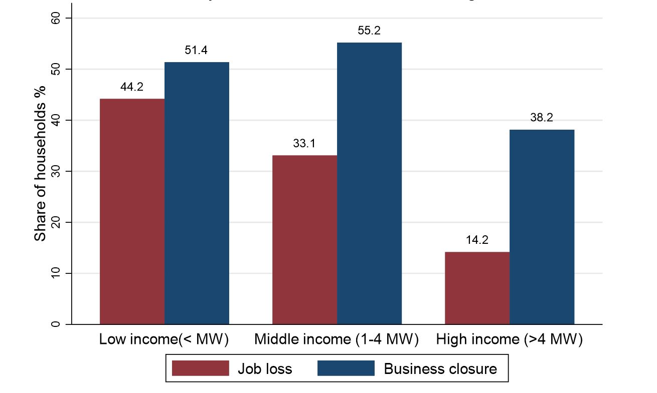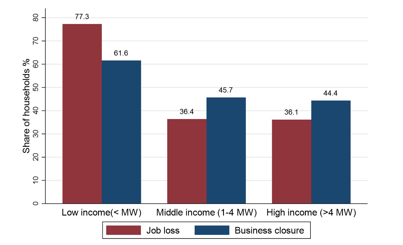 3. Labor market impacts are highly unequal. Lower average incomes and uncovered basic needs reflect an unprecedented rate of job losses in the region. Figures 3 and 4 show that households which were relatively more disadvantaged before the crisis have been more affected in the labor market; a reality that will likely exacerbate pre-existing inequalities. Both commodity and tourism dependent countries show a larger prevalence of job losses in households that earned below the minimum wage in January 2020. A similar pattern, although less pronounced, is observed for the incidence of business closures. Tourism dependent countries approximately double the rate of job losses for both the highest and lowest brackets of the income distribution, when compared to commodity dependent counterparts: 77.3% vs 44.2% among lower income households and 36.1% vs 14.2% among higher income households.