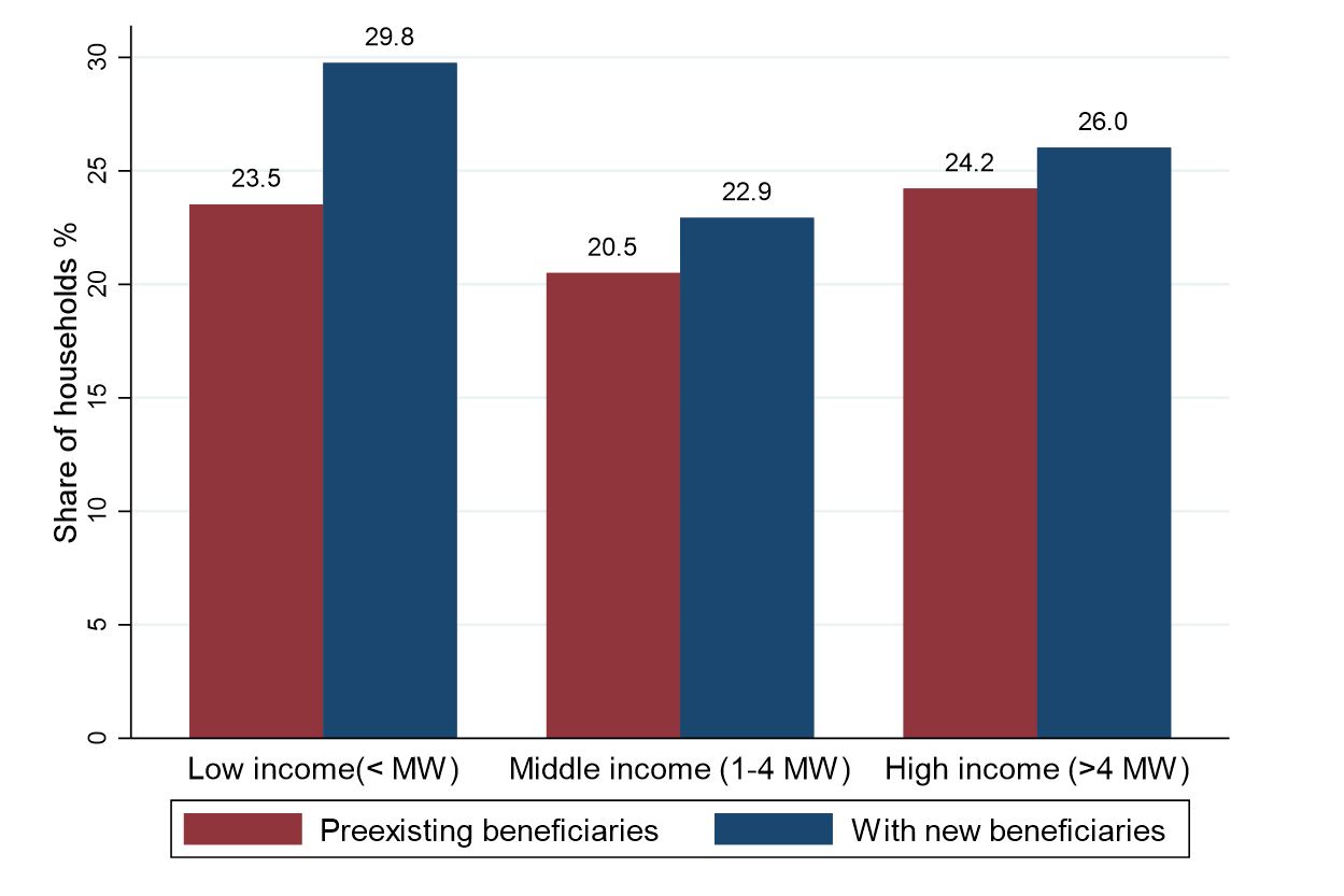 4. Social assistance programs are playing a major role in supporting livelihoods; but targeting could be improved. Most countries in the region offer universal access to health and education services, free at the point of delivery, as well as a wide range of social assistance programs. These programs have constituted important mechanisms to reach and support persons who are being affected by the crisis. Figure 5 shows social programs’ coverage rates before and during the pandemic. Social assistance programs have increased their coverage by 6.3 percentage points among low income households and by about 2 percentage points for households who earned above the minimum wage. This tells us that although social safety nets coverage has increased relatively more among disadvantaged households, they are also a source of inefficiencies in the public spending system. Indeed, leakage is significant. Pre-pandemic coverage rates were equivalent between households earning below 1 minimum wage and those earning more than 4 minimum wages (23.5% vs 24.2%).