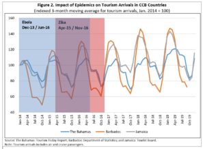 - Historical Precedents: This outbreak may be without precedent, particularly for the Caribbean region. While there have been epidemics in recent years—e.g., Ebola (2013-2016) and Zika (2015-2016)—these do not appear to have had major implications for travel and tourism to the region (Figure 2). While Zika cases were reported in the Caribbean, and health warnings were issued, broad travel advisories and restrictions such as the ones currently being enacted are without precedent. During the Global Financial Crisis, Caribbean tourism did suffer an important drop in arrivals owing largely to economic factors. Should the crisis lead to a severe economic shock to advanced economies, this may also trigger a similarly important shift in travel preferences.