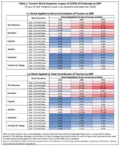 Results:While our shock scenarios (Table 1) are incomplete as they do not take all transmission channels or second round effects into account, they do highlight that the impacts of a short-lived crisis on tourism-driven output would be considerably less damaging than one that extends through the peak season beginning later in the year—particularly for countries with large seasonal variations. As noted, we apply the same shock scenarios to two variables: the direct (Table 1.1) and total (Table 1.2) contributions of tourism to each country’s overall output. At the extreme, a high-impact scenario of a 75% reduction in tourism arrivals over the last 3 quarters of the year could reduce GDP relative to the pre-crisis baseline expectation by between 11 percentage points and 26 percentage points in the case of Bahamas, and by appreciable magnitudes also for Barbados and Jamaica. Countries that are less tourism dependent would also be less affected across our range of scenarios, though other channels not simulated here could also have large impacts.