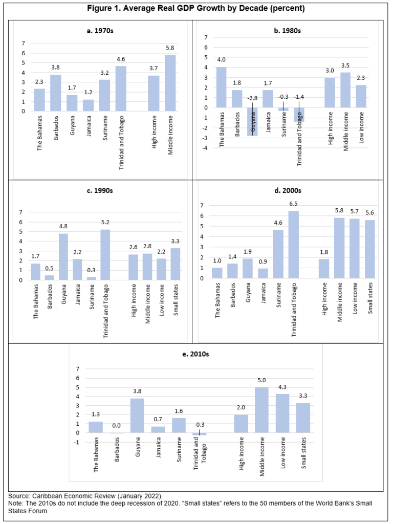Real GDP growth in many Caribbean countries has, on average, lagged that of comparable economies around the world. For many, this relative performance has deteriorated over the past several decades. As highlighted in Figure 1, while high-, middle-, and low-income countries globally have seen average annual growth rates of 2 percent or higher since the 1970s, most of the Caribbean countries have experienced considerable volatility with respect to output, and struggled to keep up. In fact, all of the six Caribbean economies examined have experienced at least one decade with average growth of 1 percent or less since the 1970s, while three have suffered at least one decade characterized by negative growth, on average. These economies have also underperformed relative to other small economies from around the world (e.g., World Bank Small States Forum members).