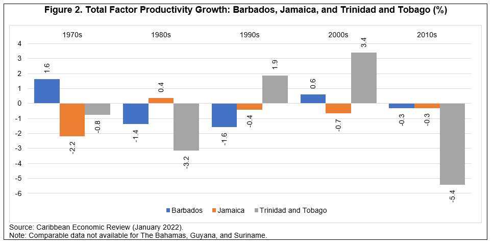 Poor and deteriorating relative growth performance in the Caribbean has many drivers and antecedents. As small and open economies, they are all highly dependent on external demand as an economic engine. Similarly, most are island or coastal economies that suffer from outsized exposure to the ravages of natural disasters and climate change. These and other shocks have undermined macroeconomic stability and complicated policymaking. But one key challenge for Caribbean economies has been slow productivity growth. Against this backdrop, total factor productivity (TFP) levels (measured in constant national prices) have fallen over the past five decades for Barbados, Jamaica, and Trinidad and Tobago. This suggests production inefficiency at the aggregate level that explains a large part of the poor growth performance described in the previous section.