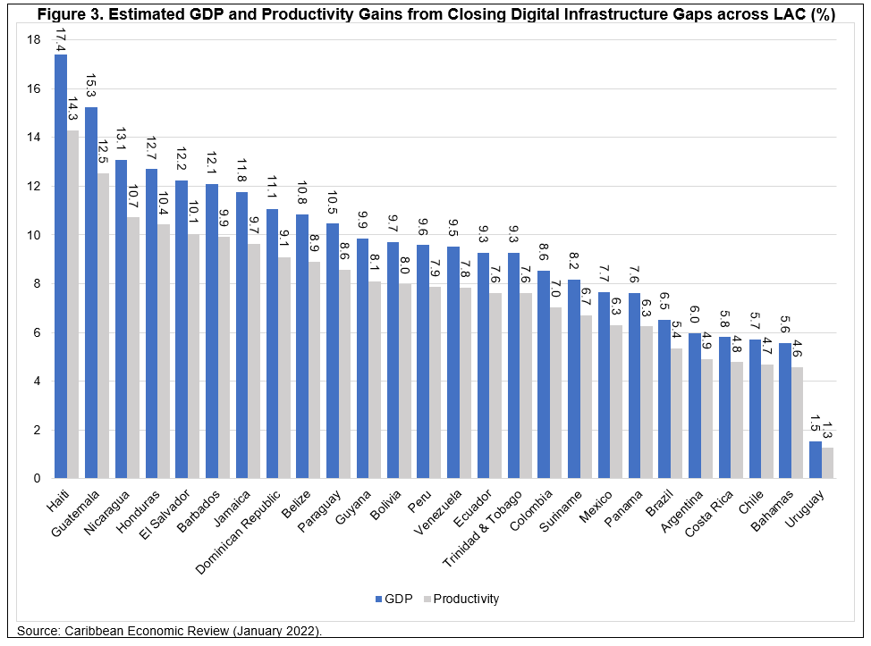 For nearly half of the Caribbean economies, this type of investment could yield cumulative GDP increases in the double digits. Similarly, for many countries across Latin America and the Caribbean this could imply transformative improvements in productivity levels (Figure 3). Taken together, this and related evidence highlighted above supports the conclusion that a reprioritization of investment in digital technology and related infrastructure could be pivotal in accelerating development—particularly for economies in the region that have relatively lower levels of income.