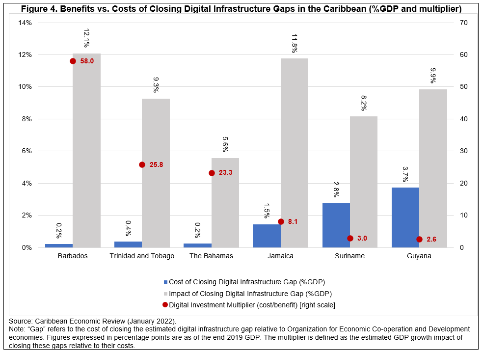 Figure 4 presents the potential implications of closing digital infrastructure gaps for the six Caribbean economies analysed here. Results and related implications for many of the Caribbean economies are striking. For example, for three of the six economies—The Bahamas, Trinidad and Tobago, and Barbados—, the potential benefit in terms of the cumulative positive impact on growth could be between 23 and 58 times the associated costs. In each of these three cases, the estimated cost of closing these digital infrastructure gaps is relatively small—under 1 percentage point of GDP in each case. For Guyana, Suriname and Jamaica, benefits are also potentially significant, despite relatively higher costs. In the case of Jamaica, for example, estimates suggest that the yield in terms of cumulative GDP benefits over time could be as much as eight times as much as the costs of investment.
