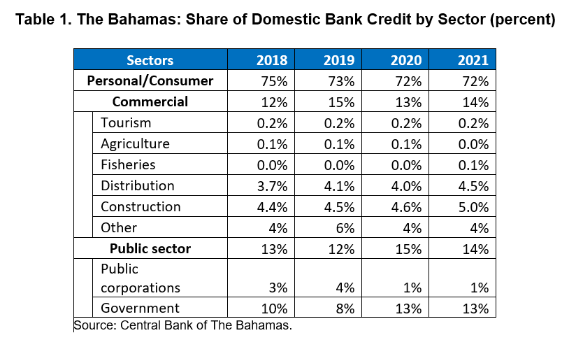 Almost three-fourths of domestic credit in 2021 was allocated to consumers (i.e., loans held by households, including mortgages). The public and commercial sectors accounted for only 14 percent each (Table 1). Both the agriculture and fisheries sectors have received negligible shares of financing from domestic banks since 2018. Since 2018, agriculture, fisheries and forestry have accounted for between 0.5% and 0.8% of GDP, which is fairly small, but is relatively consistent with its share of total private-sector credit, which has been 0.7% since 2018. Depending on their operations and financing needs, this low share of credit may be a constraint in encouraging local food production and diversifying the country’s tourism-dependent economy.