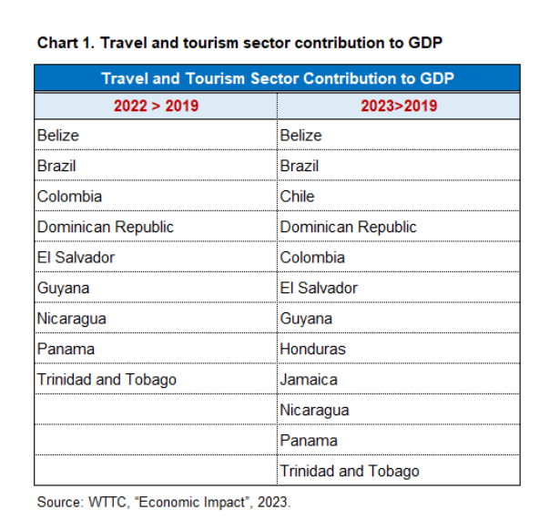 - Of all the 26 IDB borrowing countries, approximately a third managed to reach or exceed in real terms the pre-pandemic contribution of the travel and tourism sector to GDP in 2022 (9 out of 26 countries, see Chart 1).