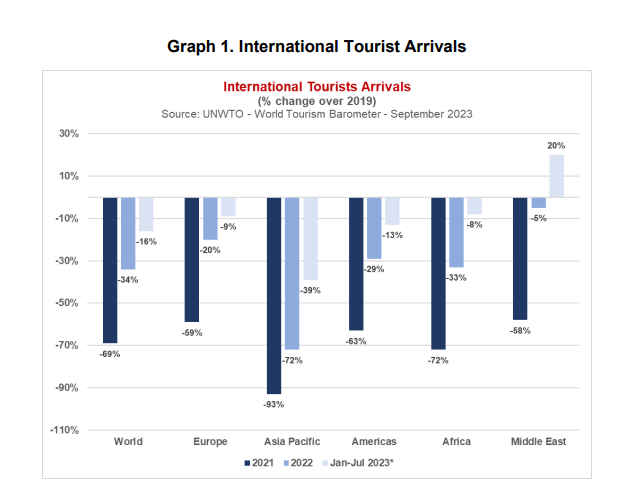The World Tourism Organization (UNWTO) recently announced that we were approaching full recovery. Between January and July 2023, international arrivals reached 84% compared to the pre-pandemic level. The Middle East leads the recovery, having notably surpassed 2019 levels (120%), followed by Africa (92%) and Europe (91%). The Americas stands at 87%, and Asia and the Pacific Region at 61%.