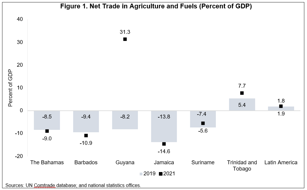 Rising hydrocarbon prices have had an obvious positive effect for net exporters, and the inverse for net importers. The case is similar for net exporters and importers of agricultural commodities. One simple way to measure the potential impact is to look at the net trade value of these commodities as a share of GDP. For net importers (The Bahamas, Barbados, Guyana, and Jamaica), net imports of hydrocarbon and agricultural commodities ranged from about 5% to 15% of GDP in 2021 (see Figure 1). This implies that substantial price increases of those products can have a significant impact on the trade balance and real incomes.