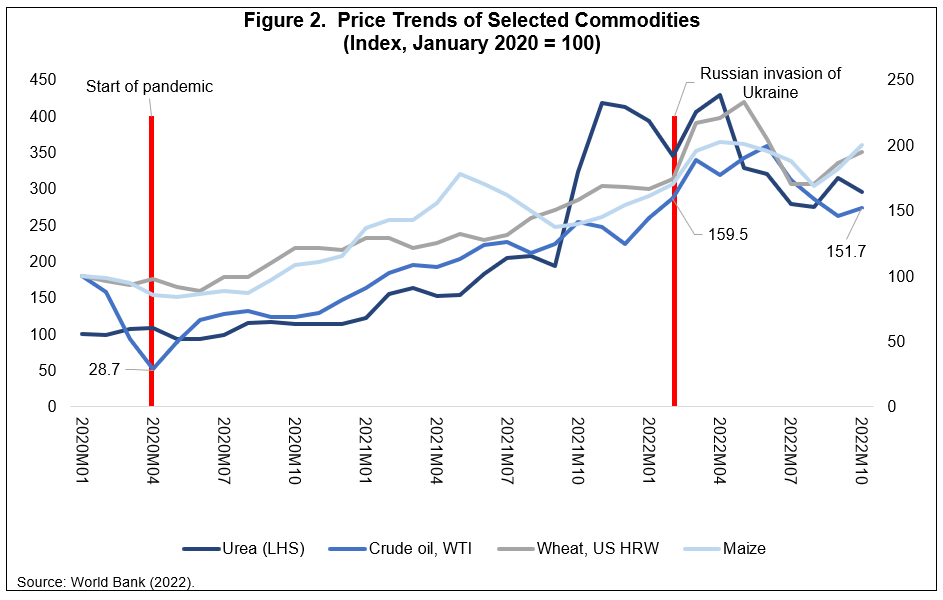 Since January 2020, the global prices for wheat, urea, crude oil and maize have risen by 51%, 95%, 100% and 195%, respectively (see Figure 2). Initially, the pandemic resulted in supply chain bottlenecks, which persist to some degree today. However, the onset of the conflict in Ukraine in late February 2022 sent further shockwaves through global commodity markets—particularly for wheat, urea (a component of many fertilizers), crude oil and maize. Russia is a major producer of all four commodities, while Ukraine is a major producer of maize and wheat and, thus, the conflict has further restricted the supply of these key commodities. Although since the summer, the affected commodity markets have cooled, prices are still expected to be elevated compared to their pre-pandemic norm. There are still risks that could throttle this recovery, including unexpected weather developments, and the discontinuation of recently resumed Ukrainian grain shipments. The gradual reopening of China’s economy since December 2022 could further increase global demand for commodities, and thus place upward pressure on prices. Furthermore, pegged foreign currency rates have shielded several Caribbean economies from inflation passthrough resulting from currency depreciation, but foreign reserves will face increasing pressure as foreign interest rates progressively rise.
