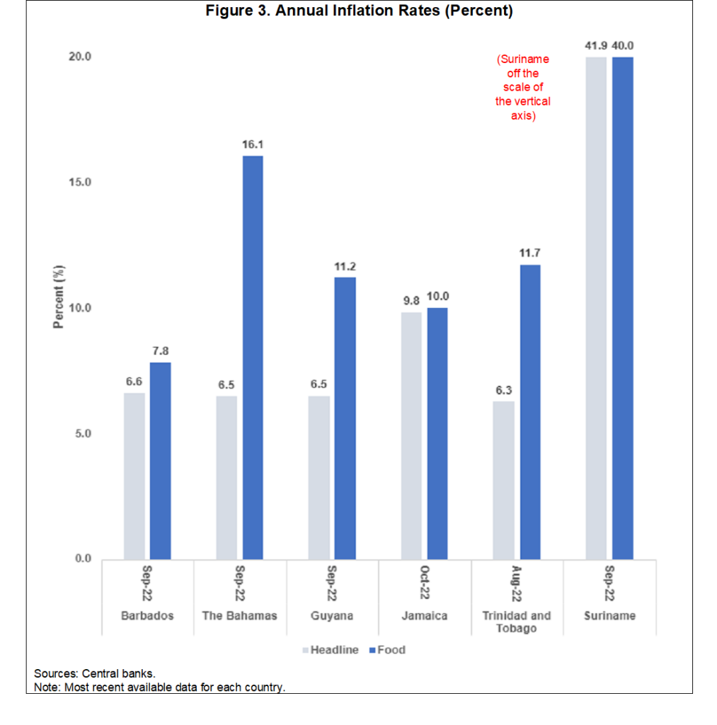 The annual inflation rate climbed to an average of 8% by mid-summer in the Caribbean countries covered in our report, excluding Suriname, which has been coping from high inflation since the fall of 2020 (see Figure 3). This average inflation rate is lower than that being experienced by many other countries elsewhere but is still very high compared to the pre-crisis period and historical standards. Against this backdrop, some Caribbean countries have undertaken active economic and monetary policies aimed at curbing price increases, but this has come at the cost of tightening financial conditions, with implications for the nascent recovery.