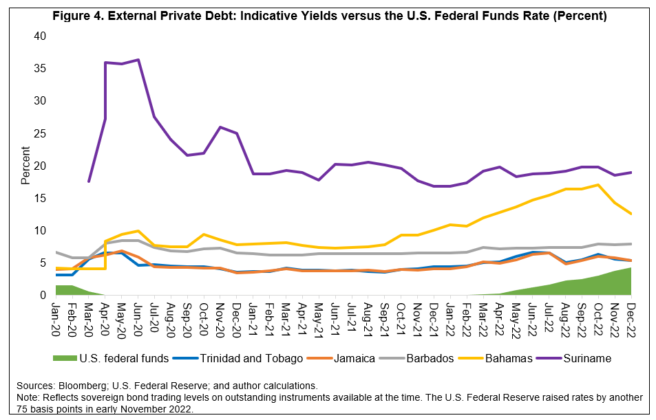 Of the converging headwinds affecting developing and emerging market economies, higher financing costs are among the most consequential. Figure 4 highlights the evolution of indicative external private sovereign funding costs for five of the six Caribbean economies between January 2020 and December 2022, set against the U.S. federal funds rate. Note that for all five economies for which data were available (excluding Guyana), the onset of the crisis in early 2020 caused indicative sovereign bond yields to increase. In some cases, this has been driven largely by higher advanced economy interest rates and related increased yields on less risky sovereign debt instruments. In other cases, these higher borrowing costs have also been driven by uncertainty and generalized market risk aversion. By December 2022, yields on outstanding private debt were higher than in January 2020; in some cases, by wide margins. Of course, it is also important to note that for many small economies, secondary markets for sovereign bonds are shallow, so spreads should be interpreted with that in mind. But regardless of the magnitude of change, increasing funding costs at home and in foreign markets have been driven by foreign economic policies, generalized risk aversion, and domestic factors linked to solvency assessments. The latter depend on fiscal and debt positions as well as external balances, which are discussed at length in our report.