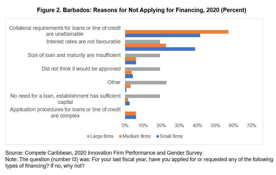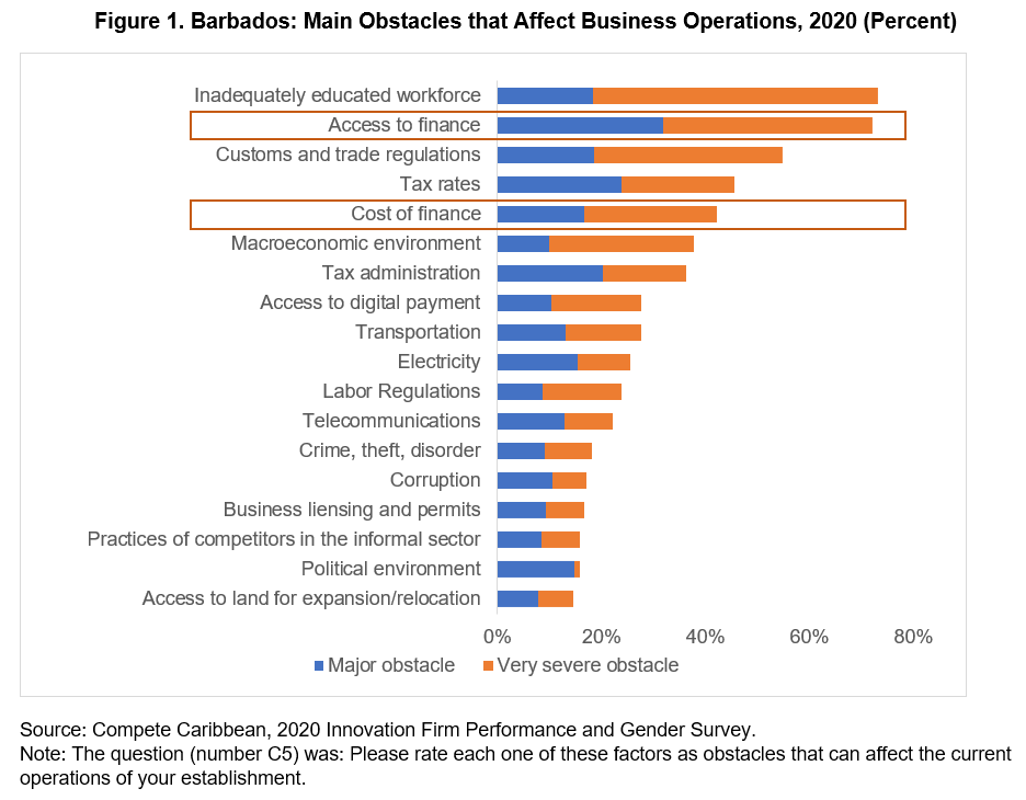 According to Compete Caribbean’s 2020 Innovation Firm Performance and Gender Survey, firms in Barbados considered access to finance and costs to be some of the main obstacles they face when conducting businesses (Figure 1). Access to finance was reported as the second most severe obstacle, after an inadequately educated workforce, and was identified as a major or severe obstacle by 72% of respondents. Cost of financing was reported as being a challenge by 43% of surveyed firms. It is noteworthy that in both cases concerns have increased since Compete Caribbean’s 2014 Productivity, Technology and Innovation in the Caribbean Survey.