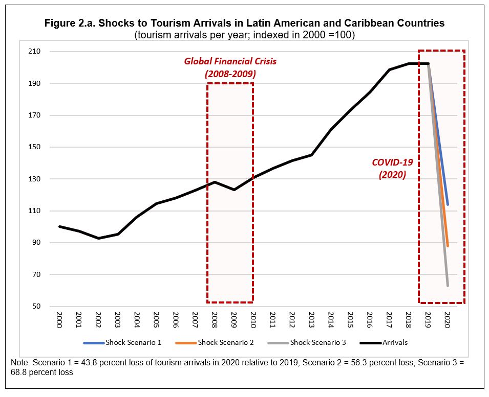 - Shocks to Exports: The publication also illustrates the potentially devastating implications of the crisis for exports—particularly tourism receipts—and the balance of payments. Countries in the region that depend on external demand have and will continue to experience unprecedented losses of foreign exchange inflows, that have been crucial in terms of their role in financing imports, servicing external liabilities, and supporting exchange rates. Scenarios presented in the publication underscore the importance of vigilance and proactive action on the part of governments and private sectors to avoid a disorderly adjustment.