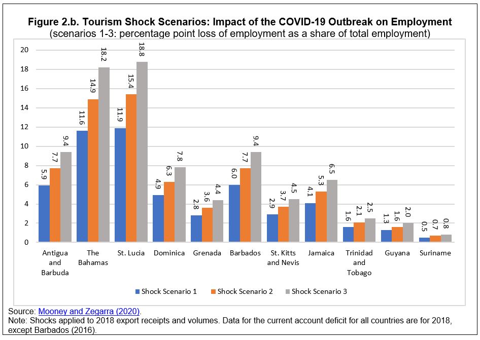 - Shocks to Employment: For Caribbean countries that are most dependent on tourism, such as The Bahamas and St. Lucia, anywhere from 12 percent (Scenario 1) to as much as 20 percent of the labor force (Scenario 3) could be adversely affected by the pandemic (Figure 2.b). It is worth noting that these shocks have been applied to the direct contribution of the tourism industry to employment, which does not take into account other sectors (e.g., retail, services, construction) that are likely to be adversely affected by the loss of jobs and purchasing power for those working directly in tourism. Taken together, these and related exercises underscore the human dimensions of this crisis—many individuals and households in the region will suffer, implying severe social costs that are difficult to capture with economic aggregates.
