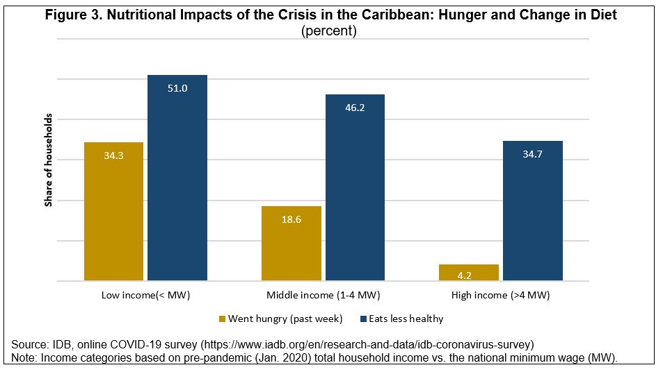 - The social impacts of the ongoing crisis are significant. Simulations of the employment impact of tourism shocks provide a sobering perspective. In addition, evidence provided by an online survey carried out in April reveal that for households earning less than the minimum wage, a striking 34 percent of respondents had gone hungry in the previous week, and just over half stated that they had consumed less healthy food. About 60 percent of low-income households reported a job loss in the household. There are important gender dimensions as well: job losses and nutritional outcomes were worse for women, and some women reported an increase in domestic violence.
