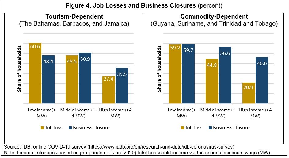 Labor Market Impacts of the Crisis: Labor market outcomes have also been dramatic, with job losses and business closures for business owners reported at a high level in both tourism- and commodity-dependent economies (Figure 4). The numbers are worse for the poor—with about 60 percent of low-income households surveyed reporting job losses.