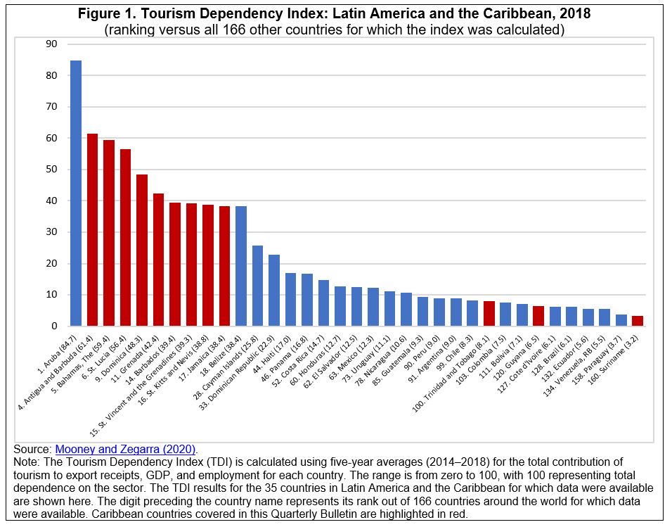 Tourism was adversely affected during the first quarter of 2020 as the crisis began to unfold, and the sector was effectively shut down during the second quarter as complete travel prohibitions came into place. Expectations for the third quarter remain uncertain, but prospects for a rapid return to pre-crisis levels of demand remain grim. Nearly a dozen Caribbean countries—including the six Organization of Eastern Caribbean States (OECS) sovereign countries, as well as The Bahamas, Barbados, and Jamaica—rank in the top 20 on our new global index of economic dependence on the sector, dubbed the Tourism Dependency Index (TDI). The TDI is calculated for 166 countries worldwide for which data were available. The range is from zero to 100, with 100 representing total dependence on the sector. Index results for 35 countries in Latin America and the Caribbean for which data were available are shown in Figure 1, with the countries analyzed in this Quarterly Bulletin highlighted in red.