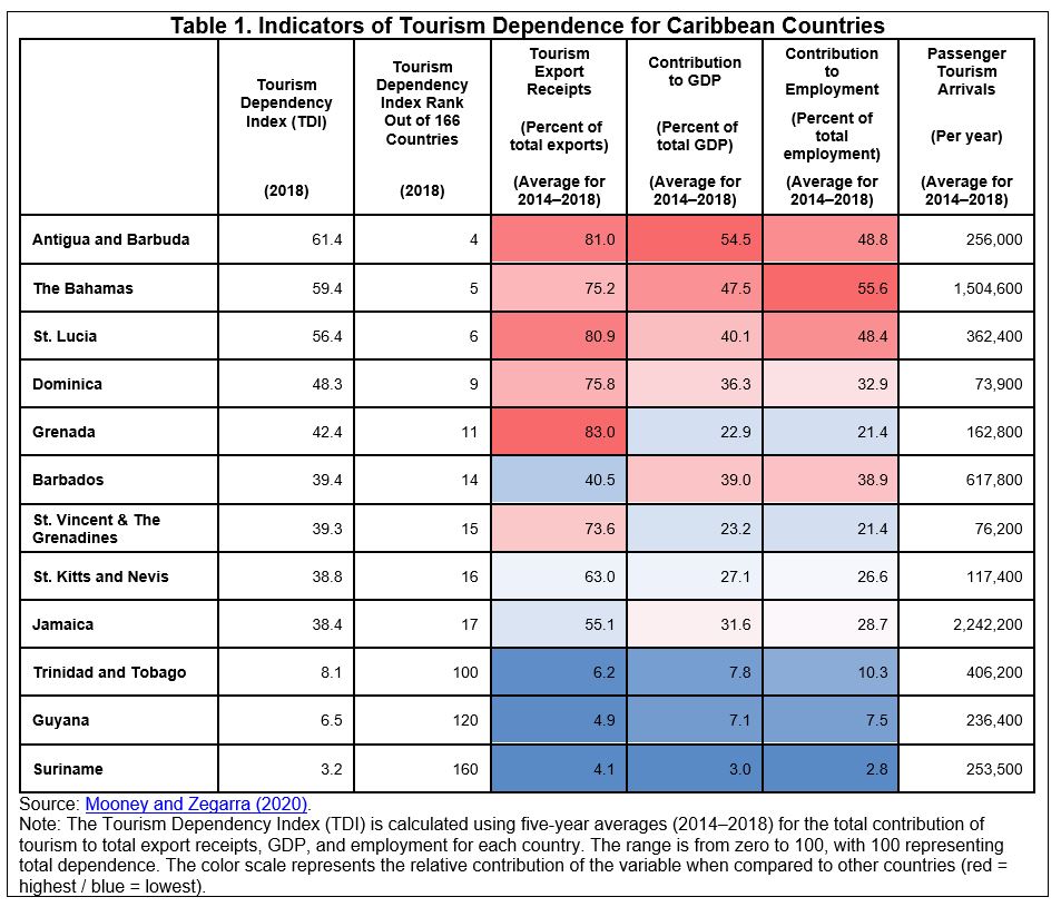 Indicators of Tourism Dependence: Caribbean countries are among the world’s most dependent on tourism with respect to the three critical variables included in the TDI index. For example, over three-quarters of export receipts are linked to tourism in Antigua and Barbuda, The Bahamas, Dominica, and Grenada (Table 1). Similarly, the total contribution of tourism is 40 percent or more in terms of both GDP and employment for Antigua and Barbuda, The Bahamas, St. Lucia, and Barbados. Taken together, this suggests that the Caribbean could be the most adversely affected region in the world in terms of the economic impact of COVID-19.