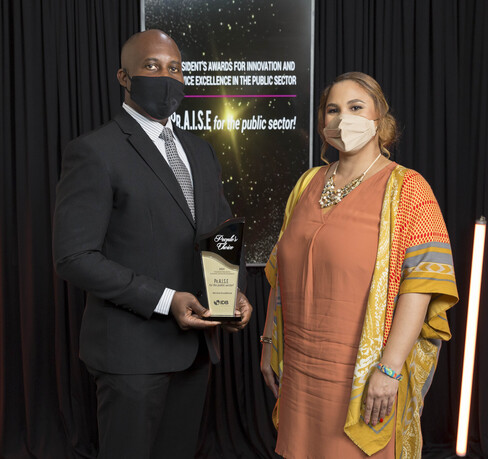 Betrand Moses, Coordinator Child Development of Gender and Child Affairs, Bertrand Moses receiving the People’s Choice Innovation award from Pr.A.I.S.E. Committee Chair 2021, Karelle Clark In the Innovation category, the revolutionized on-line course to educate citizens about safety and protection of the nation’s children conducted by the Gender and Child Affairs Division copped the prize.