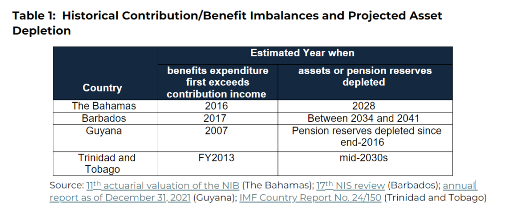 Unfortunately, several National Insurance Schemes have been running deficits for years, and some are expected to deplete either their assets or pension reserves within this decade (Table 1). Jamaica is noticeably absent as its National Insurance Scheme, since the implementation of several reforms in the mid-2010s, has been generating surpluses due to contributions received exceeding benefits paid and relatively high investment income. This, however, is largely explained by its low coverage and replacement rates.