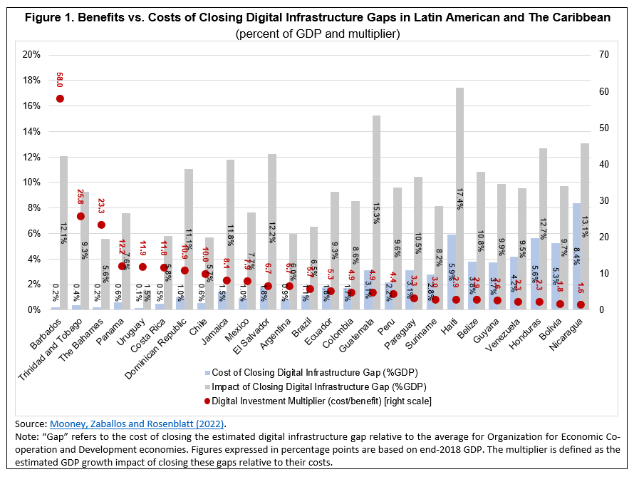 As highlighted in Figure 1 (above), this research suggests that for all countries in Latin America and the Caribbean, the benefits associated with closing digital infrastructure gaps in terms of cumulative increases in economic output (GDP) would outweigh the associated investment costs.