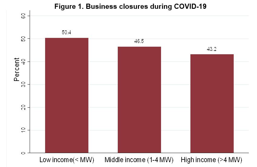 - The IDB online survey found that business closures were highest amongst hotels and restaurants (79 percent), construction (60 percent), and manufacturing (53 percent) sectors. Business closures were also marginally higher for low income households (Figure 1).