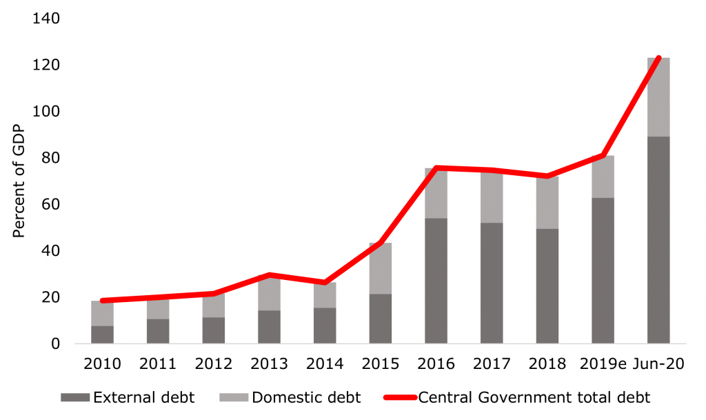 Wat het fiscaal beleid betreft, zijn de fiscale inkomsten van Suriname sterk afhankelijk van grondstoffen en maken niet-discretionaire items het grootste deel uit van de uitgaven. Bij gebrek aan een adequaat beleidskader maakt een dergelijke situatie het land kwetsbaar voor onverwachte schokken. Uit ons recente economics bulletin bleek dat voor de periode 2010-2019 de inkomsten van de centrale overheid gemiddeld 22,4 procent van het BBP bedroegen, waarbij grondstoffen gemiddeld 28,7 procent van de totale overheidsinkomsten bijdroegen. De uitgaven van de centrale overheid over dezelfde periode bedroegen gemiddeld 30,1 procent van het BBP, waarbij subsidies en lonen ongeveer 60 procent van de totale overheidsuitgaven uitmaakten. De totale uitgaven als aandeel van het BBP stegen van 24,6 procent in 2010 naar 44,6 procent in 2019. De stijging van de uitgaven komt voornamelijk door subsidies: de subsidies stegen van 4,5 procent van het BBP in 2010 naar 15,3 procent van het BBP in 2019 (figuur 1). In de context van aanhoudende begrotingstekorten, wisselkoersaanpassingen en een economische depressie is de staatsschuldquote aanzienlijk gestegen van 18,5 procent van het BBP in 2010 tot 123 procent van het BBP in juni 2020 (figuur 2).
