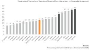 27% of people in Guyana reported having to pay a bribe to access a public service, 20% in The Bahamas and 17 % in Trinidad and Tobago and Jamaica. Manual government transactions, face-to-face interactions, and the lack of standardized processes means transactions are more vulnerable to corruption.