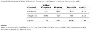 In-person services are more expensive to provide due to personnel costs and other inputs such as office space and supplies. For example, in the United Kingdom a single in-person transaction costs the Government $15.32 USD, while the average online transaction costs $0.44 USD to administer. However, in the Caribbean, most Government transactions are not available online. Only 8% of citizens in the Caribbean report having carried out their last government transaction online.