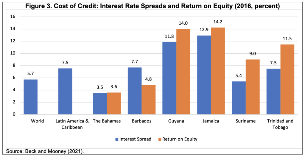 High costs of credit have been an impediment to access across the region… Our research also focuses on some reasons why firms may face challenges in accessing finance. For example, cross-country surveys suggest that high interest rates, the need for collateral or guarantees, and the complexity of loan applications are among the most common reasons why firms do not apply for loans. In this context, IDB-sponsored enterprise surveys suggest that impediments to finance, such as prohibitive collateral requirements and the high costs of borrowing, are among most commonly-reported challenges to firm productivity and performance. These impediments tend to be more acute for smaller firms. Other enterprise survey results confirm these conclusions, highlighting the fact that with the exception of Barbados, firms in all CCB countries reported collateral requirements that are higher than both cross-country and regional averages. Similarly, we consider indicators linked to the costs of credit, including interest rate spreads and bank profitability in these jurisdictions, and find that Jamaica, Guyana, and Trinidad and Tobago appear to host banking sectors characterized by high profitability and relatively high interest rates on loans. These and related indicators tend to suggest the presence of structural deficits preventing local banks in several CCB countries from providing funding at more reasonable costs (Figure 3).