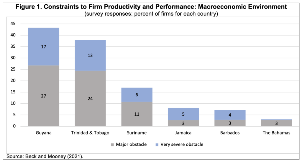 Our research documents a variety of outcomes in terms of financial depth, access, and adequacy. In terms of the depth of credit markets—the base of the financial pyramid—, most CCB countries compare poorly with both regional peers, and other countries at similar levels of income and development. Jamaica, Suriname, and Trinidad and Tobago in particular have seen only limited progress in terms of financial deepening since the 1980s, likely owing to policy inconsistencies—for example, unsustainable fiscal or debt situations, high inflation and interest rates, and/or uncompetitive exchange rates—, and the impacts of large external shocks. In this context, surveys of firms have reported concerns over the macroeconomic environment as among their most significant challenges to productivity and performance (Figure 1).