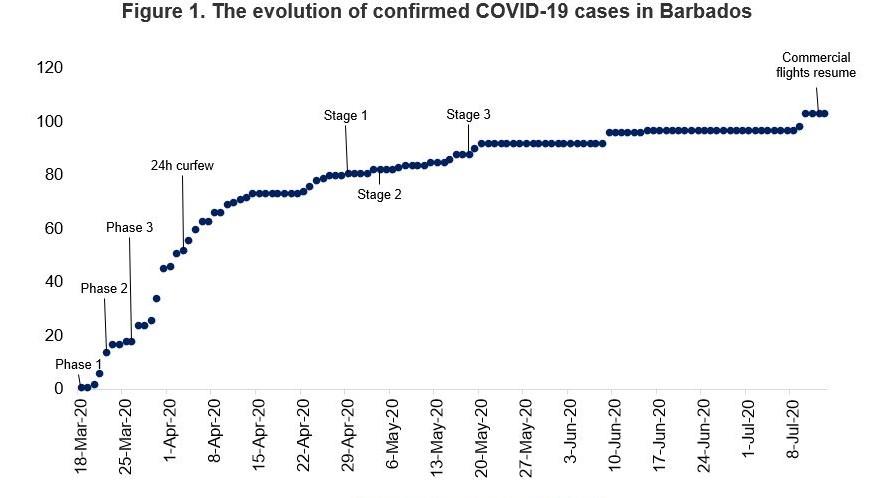 Barbados is a regional hub for travel and tourism, which has exposed it more to imported cases than other countries in the region. Strict social distancing measures, contact tracing, and the expansion of testing have been key to flattening the curve. These have been complemented by both higher funding for the health sector and additional health workers. As seen in the figure below, the country closed down in three phases, starting at the end of March 2020 and following WHO protocols. The reopening took place in three stages once there were signs of flattening the epidemiological curve.