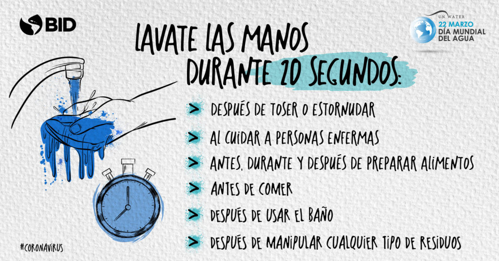 La pandemia del coronovarius (COVID-19) es un recordatorio de lo vitales que son los servicios de agua y saneamiento de calidad para todos. Hoy que conmemoramos el Día mundial del agua, les recordamos la importancia de cuidar el recurso, pero en este año en particular queremos subrayar la importancia de cuidarnos todos. Lavarse bien las manos con agua y jabón durante 20 segundos es la mejor forma de prevenir el contagio y la propagación del coronavirus. Junto con las medidas de distanciamiento social, el aseo con agua y jabón es, a la fecha, el método más eficiente y barato para evitar el contagio. Por eso, este Día mundial del agua, nuestro llamado no puede ser más urgente: A cuidar el agua más que nunca y ¡A lavarse las manos! Sin embargo, ¿qué pasa cuando la única fuente de agua para familias o comunidades enteras está lejos de casa? Como la gran mayoría de las crisis globales, la pandemia del coronavirus representa una mayor amenaza para los ciudadanos más vulnerables. En América Latina y el Caribe hemos mejorado mucho en brindar acceso a agua; pero la cobertura todavía no es universal. Esto es particularmente importante para nuestra región, la más urbanizada del planeta, donde cerca del 80% vivimos en ciudades. Es precisamente la población más vulnerable a la que tenemos que enfocar buena parte de nuestros esfuerzos en momentos de emergencia global como el que estamos viviendo. Hoy en día cerca alrededor de un tercio de la población en nuestra región carece de servicio de agua potable segura para beber. La situación es mucho más precaria en cuanto al servicio de saneamiento, puesto que 70% de los hogares no tiene acceso a un manejo adecuado de excretas. Un porcentaje significativo de hogares no tendría acceso a instalaciones de higiene: alrededor del 75% o menos de los hogares en por lo menos seis países no cuentan con servicios de higiene básicos. También es importante asegurar la provisión de servicios de agua saneamiento e higiene en centros de salud. Alrededor del 5% de los centros asistenciales no tiene acceso a servicios de agua, lo cual representa un doble desafío para esos centros asistenciales a la hora de enfrentar la emergencia del coronavirus al experimentar una demanda elevada de pacientes, y al no contar con los medios básicos para mantener un ambiente limpio. En ese sentido, las empresas operadoras de agua y saneamiento son un aliado importante de la salud pública para contener el avance de la pandemia. Se deben tomar medidas de emergencia, entre ellas elaborar planes de contingencia, si es que no los tuviesen, para asegurar un servicio de calidad continuo. En estos momentos el uso racional del agua es crítico para hacer frente a la pandemia. Es sumamente importante utilizar el agua primordialmente para el aseo personal, sin excesos y postergar otros usos menos urgentes, para no exponer los sistemas de producción y distribución de agua a límites difíciles de manejar. En ese sentido, es importante cerrar la llave del agua mientras se frotan las manos durante 20 segundos para evitar desperdiciar el líquido. También es importante guardar la calma y no acaparar las existencias de agua embotellada de manera que no ocurra, como todos hemos visto, con otros productos como el papel higiénico y los productos de limpieza como el alcohol en gel. En la región, países como Colombia, El Salvador y ciudades como Sao Paulo han anunciado ya prórrogas para el pago y suspensión del cobro de los servicios básico. Esto es particularmente importante para los usuarios del sector informal que no percibirán salarios diarios debido al drásticos descensos en la actividad económica como consecuencia de las medidas de distanciamiento social y cuarentena; así como población vulnerable en hospitales, asilos, sanatorios y cárceles. La pandemia nos obliga a actuar de manera rápida, pero adecuada, sin olvidar que la gran tarea pendiente es asegurar que los servicios básicos de agua y saneamiento sean accesibles para todos los ciudadanos. Este Día mundial del agua nos plantea una vez más el recordatorio que la mejor inversión de cualquier país es asegurar que el acceso a recursos como el agua tengan la máxima prioridad. El llamado es a lavarnos las manos, para evitar el contagio, pero el objetivo de llevar agua y saneamiento seguro para todos requiere hoy más que nunca, manos a la obra. Para mantenerse informado sobre medidas de prevención contra el coronavirus, le recomiendo consultar el sitio oficial de la Organización mundial de la salud.