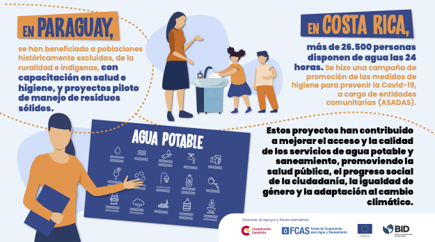 En Costa Rica, a través de tres sistemas rurales financiados por el Fondo, se ha logrado que más de 26.500 personas dispongan de agua las 24 horas del día, sin tener que desplazarse largos trayectos. Además, para prevenir contagios de Covid-19 y otras enfermedades infecciosas, se ha realizado una campaña de promoción de las medidas de higiene estipuladas por el Ministerio de Salud, con videos animados, perifoneo, mensajes radiales y piezas para redes sociales. La campaña alcanzó gran difusión gracias a que estuvo a cargo de las Asociaciones Administradoras de los Sistemas de Acueductos y Alcantarillados (ASADAS).
