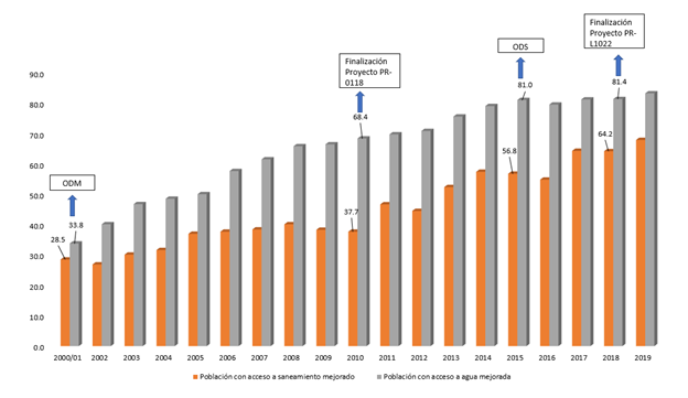 En el caso de Paraguay esta meta resultaba ambiciosa, dado que en 1990 la cobertura de agua mejorada alcanzaba apenas al 62% de la población, mientras que solo el 58% tenía acceso a servicios de saneamiento. Por otro lado, los montos invertidos eran tan limitados que, en el año 2000, cuando los Objetivos de Desarrollo del Milenio (ODM) fueron establecidos, los niveles de acceso a los servicios seguían casi iguales o peores que al comienzo de la década del 90. En el sector rural las brechas eran aún mayores. Al inicio del siglo XXI, en estas zonas del país, solo el 33% de la población contaba con un servicio de agua mejorada y el 28% con saneamiento mejorado.