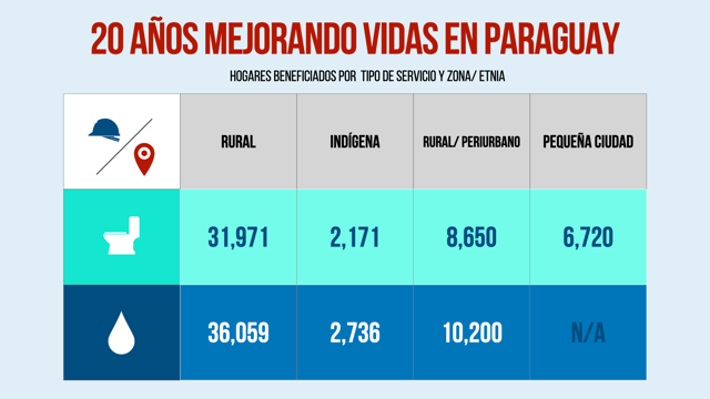 Paraguay logró aumentar la cobertura de los servicios de agua en 42% y de saneamiento en un 44%, en 20 años, gracias a inversiones sostenibles que han reducido la desigualdad en sus zonas rurales que han beneficiado a cerca de 250 mil personas.