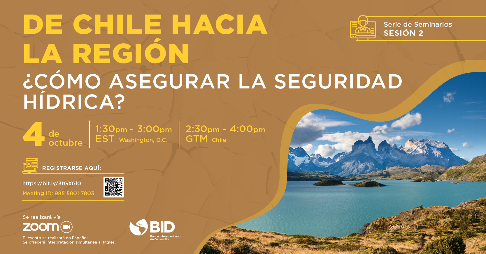 Acompáñenos este lunes 4 de octubre en el webinar "De Chile hacia la región: el camino a la seguridad hídrica" para conocer más sobre las experiencias de Chile y las lecciones aprendidas.